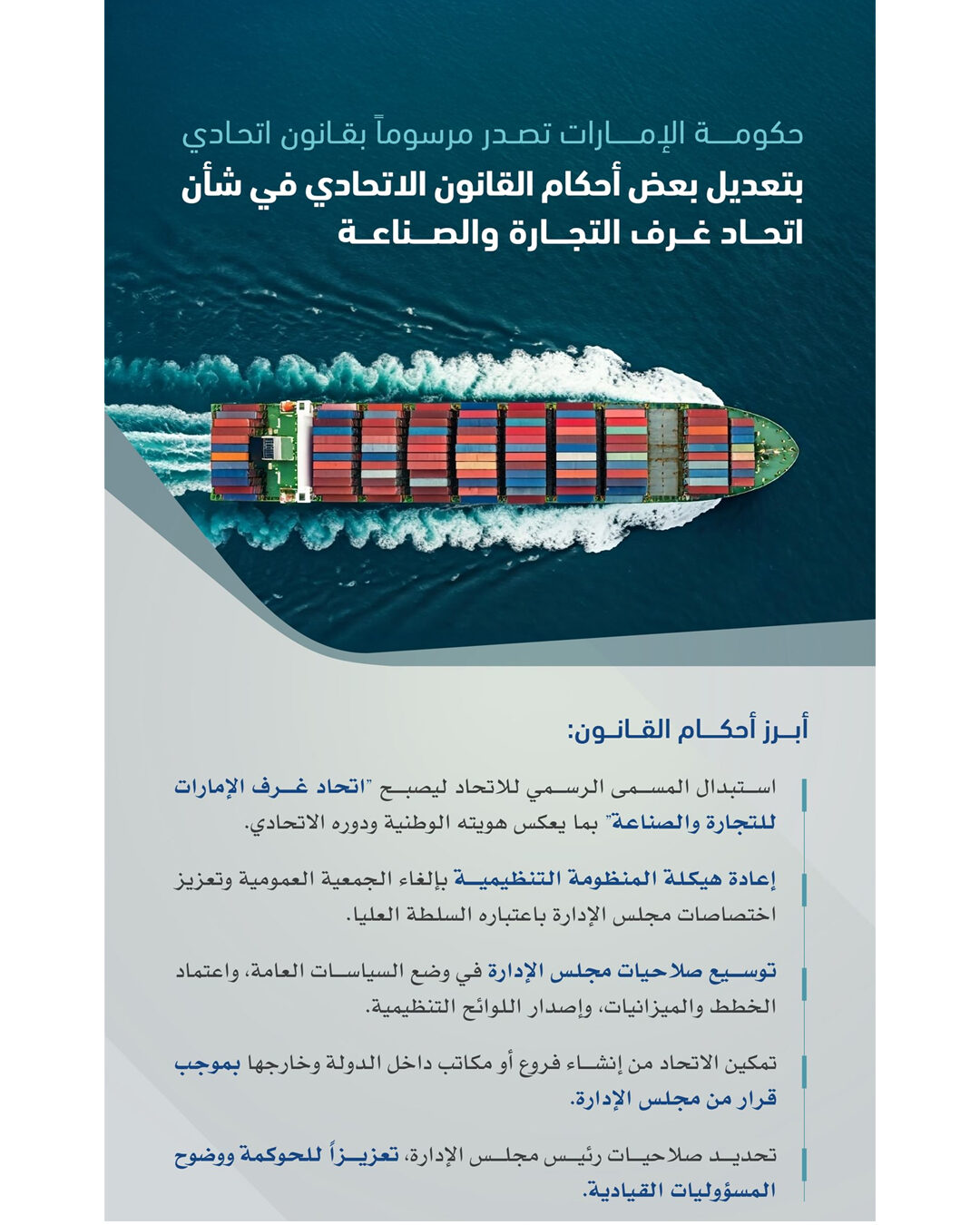 وشمل المرسوم بقانون استبدال المسمى الرسمي للاتحاد ليصبح “اتحاد غرف الإمارات للتجارة والصناعة”، تأكيداً على دوره الاتحادي الشامل، وتوحيد الهوية المؤسسية للاتحاد، وبما ينسجم مع متطلبات المرحلة المقبلة ومكانة دولة الإمارات في منظومة الاقتصاد الإقليمي والدولي.